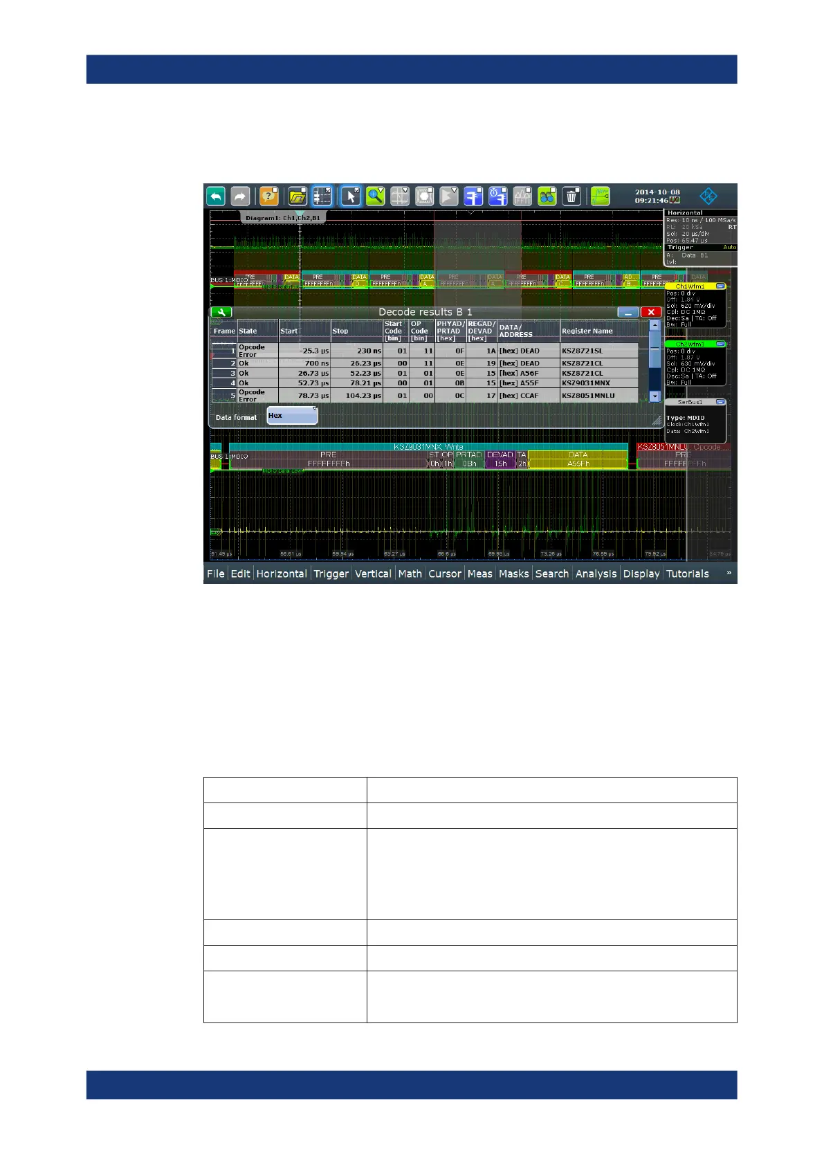 Figure 13-90: Decoded and binary MDIO signal trace, and decode results table