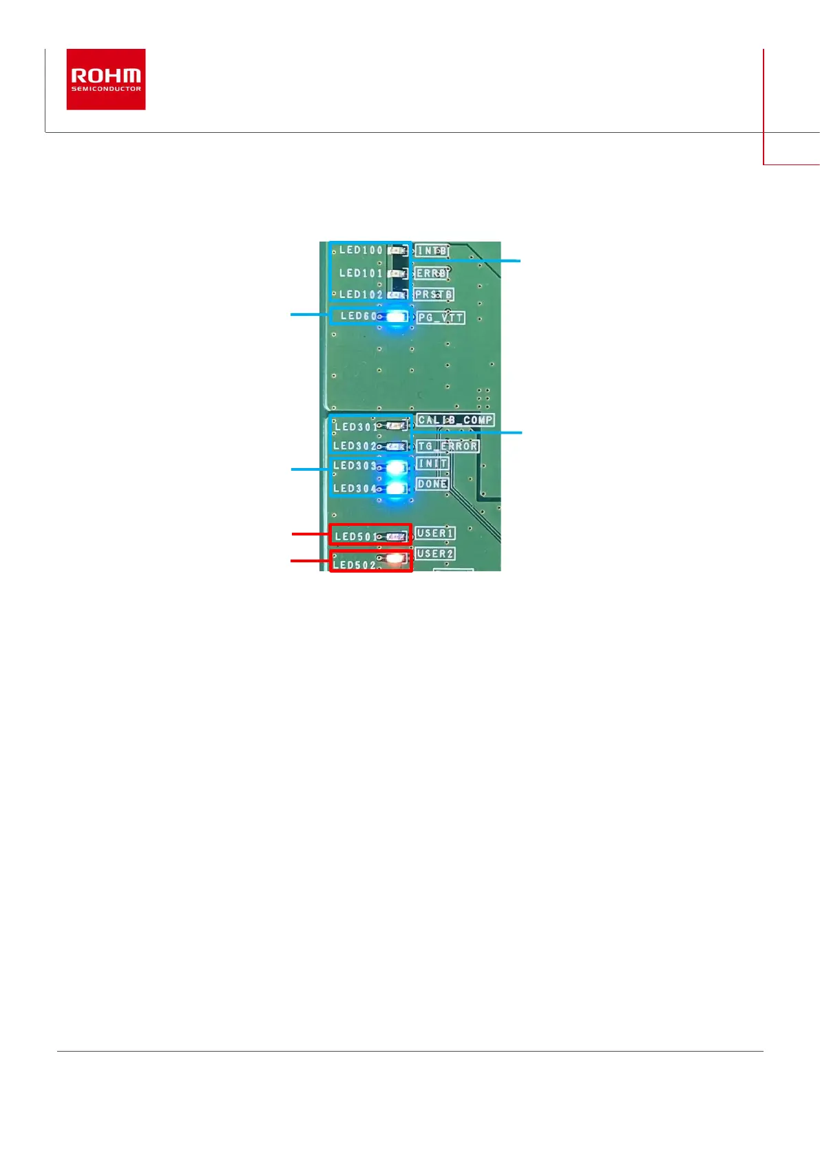 LED100 (INTB) and LED101 (ERRB) are controlled by the PMIC’s open-drain interrupt signal pins INTB and ERRB respectively. The