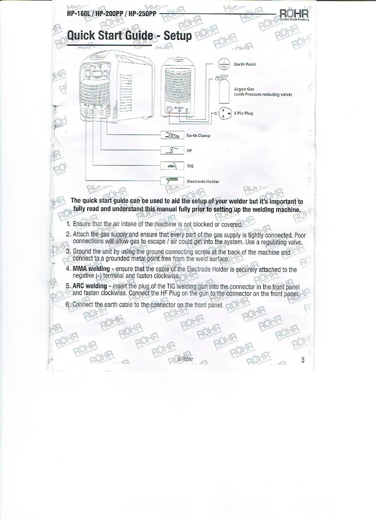 Rohr HP-250PP - Quick Start Guide - Setup; Ensure Air Intake; Connect Gas Supply; Ground the Unit