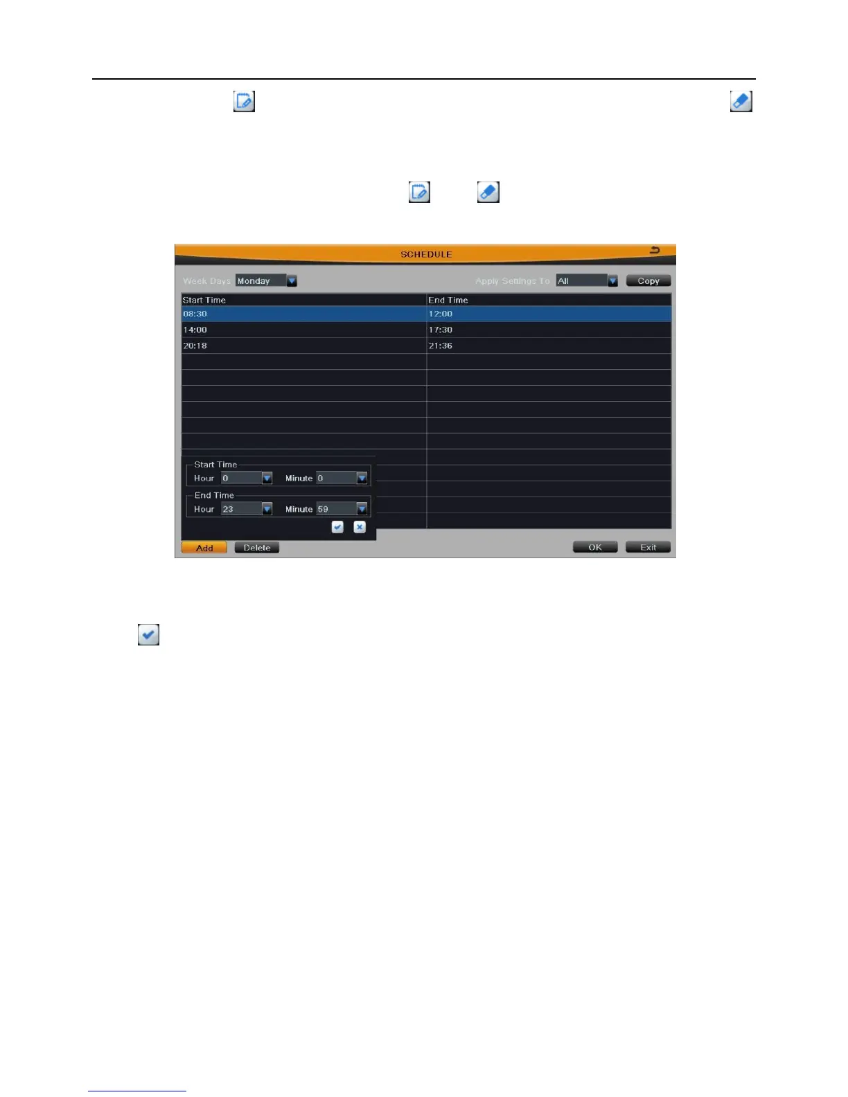 Select a week day; click “Add” button, then set the start & end time of recording plan,