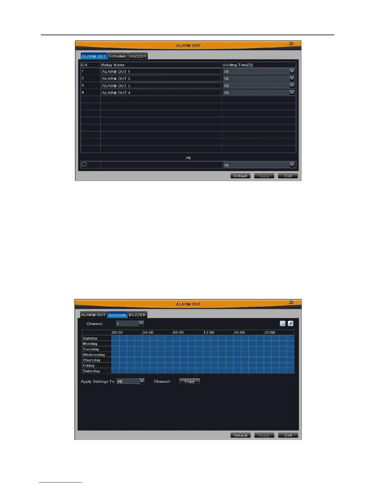 Note: The default schedule of alarm out is full-selected, that is, the color of