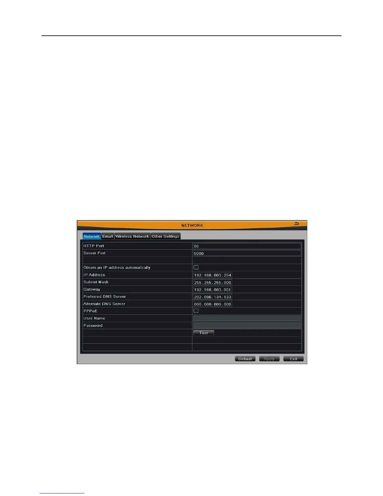Click “Default” button to restore the default setting; click “Apply” button to save the