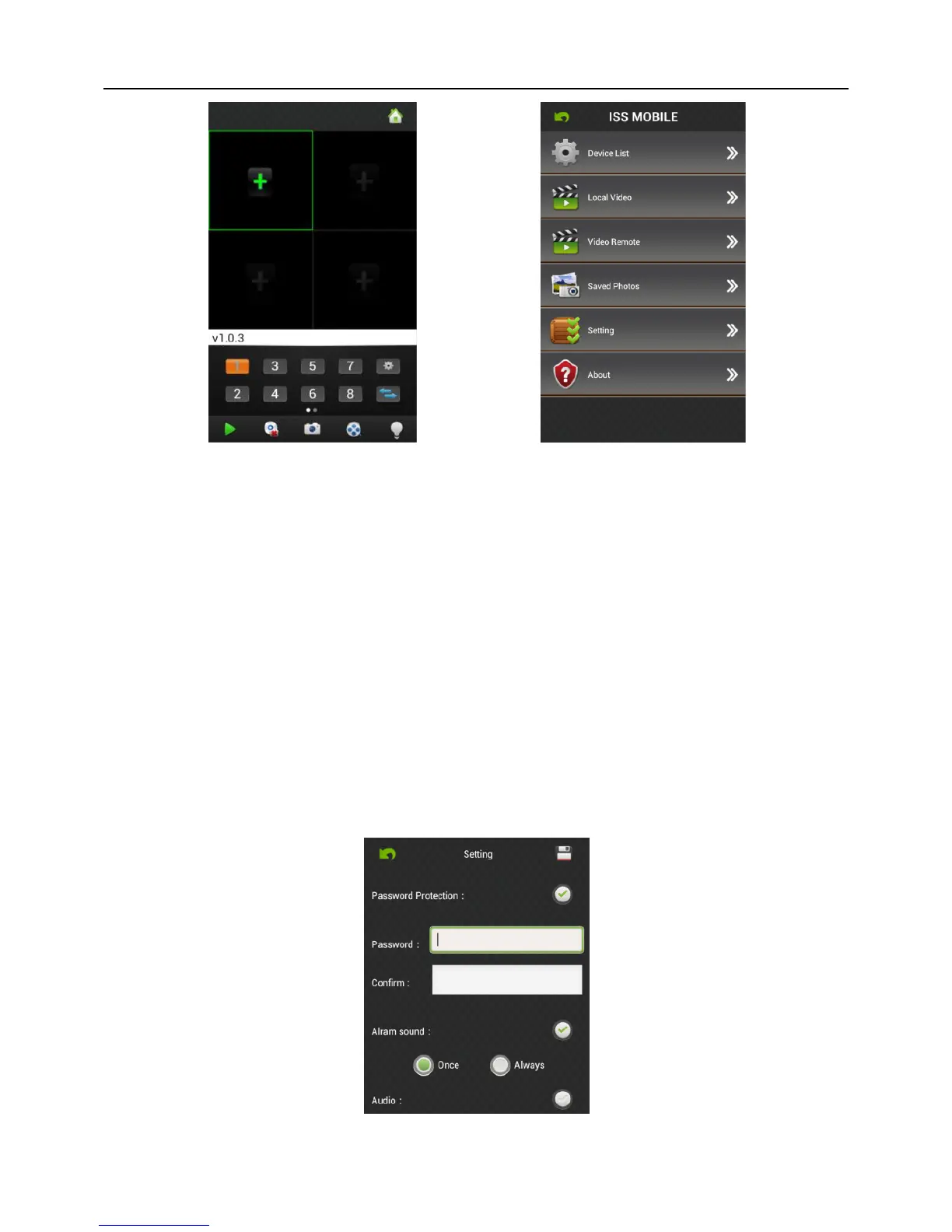 Setting: After clicking it, you can set password protection, alarm sound, etc; refer to