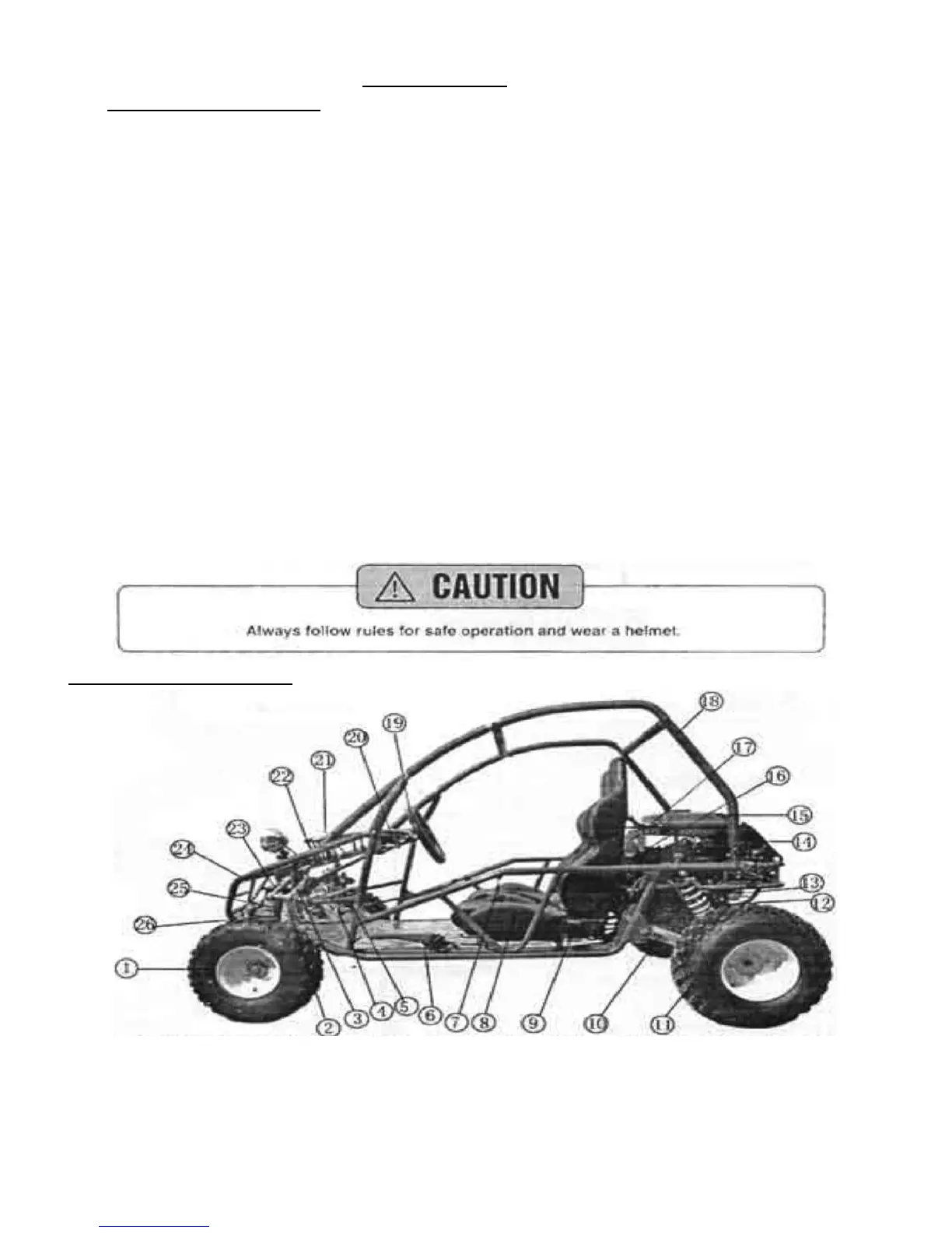 1.Front Tire 2.Front Shock 3.Swing Arm (Upper) 4.Brake Pedal 5.Throttle Pedal 6.Parking Brake