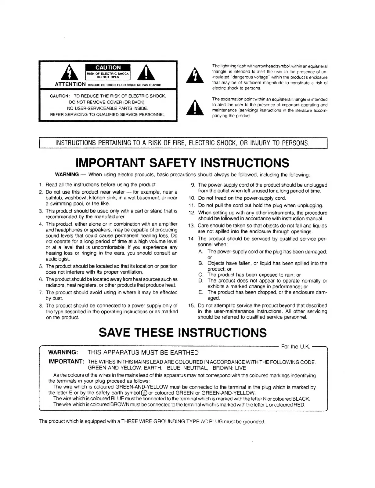 Roland 2500s - Safety Instructions; Important Safety Instructions; Electrical Safety Warnings