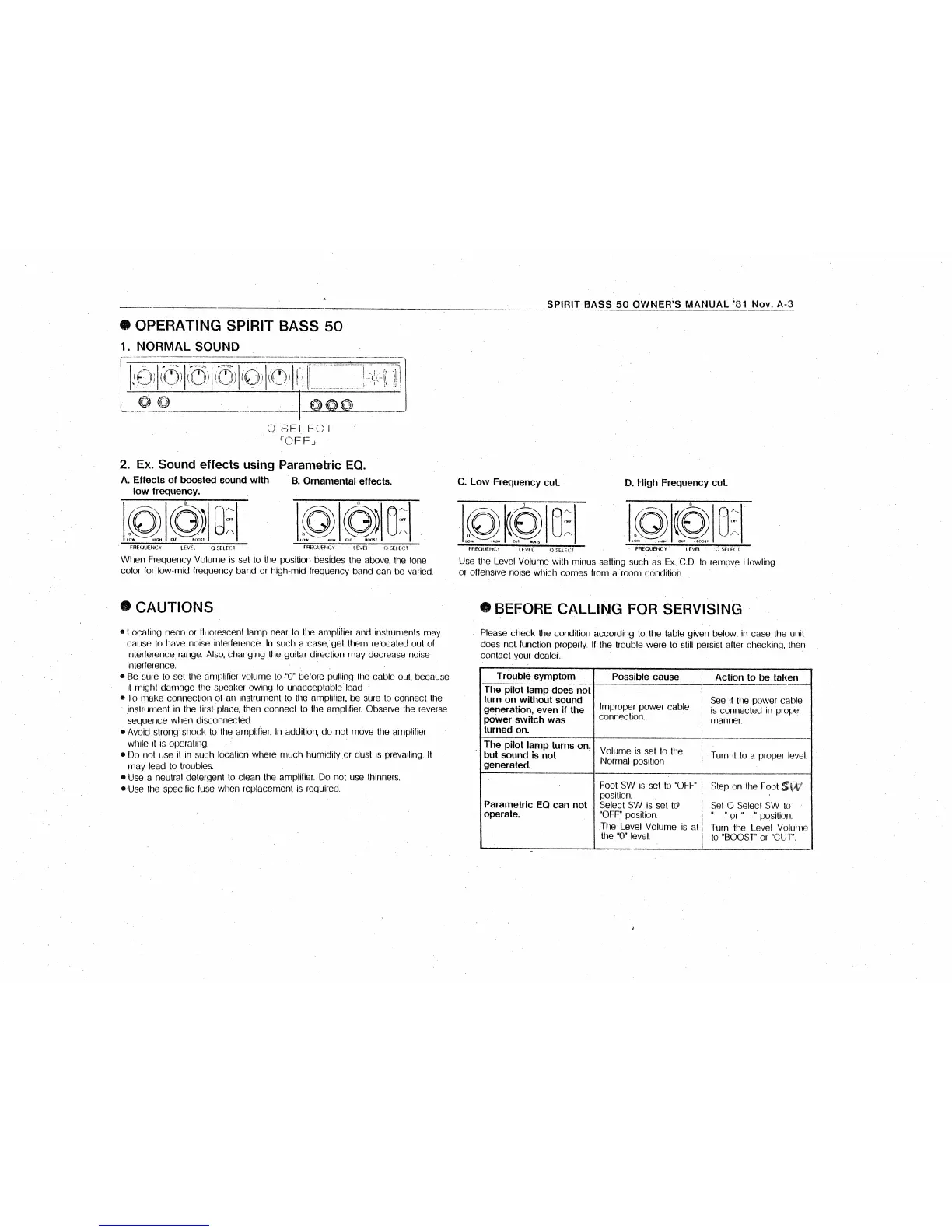 Roland 30 - Spirit Bass 50 Operation; Parametric EQ Sound Effects (50 W); Spirit Bass 50 Cautions; Operating Safety Precautions