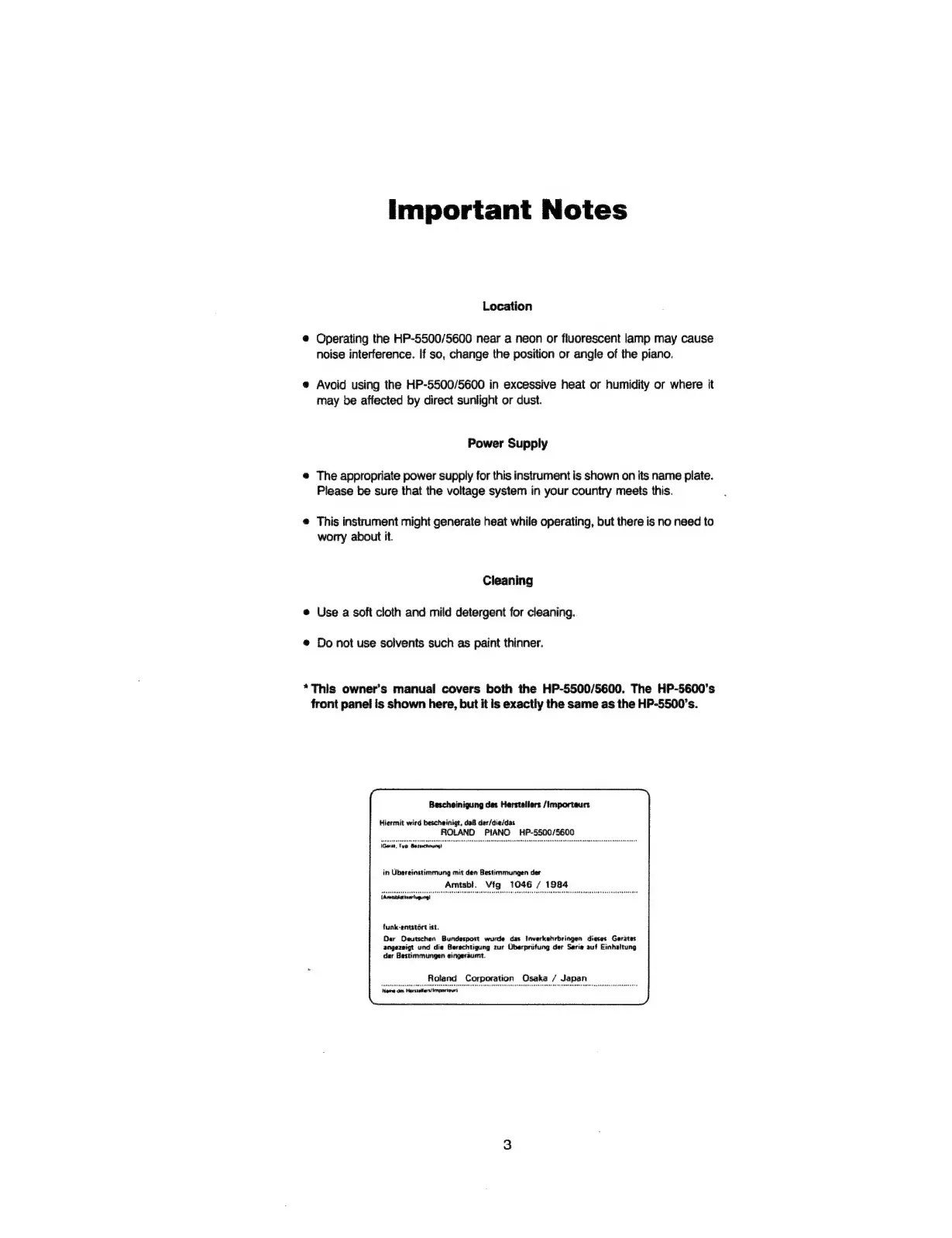Roland 5500 - Important Notes; Location and Environmental Precautions; Power Supply and Heat Management; Cleaning Instructions