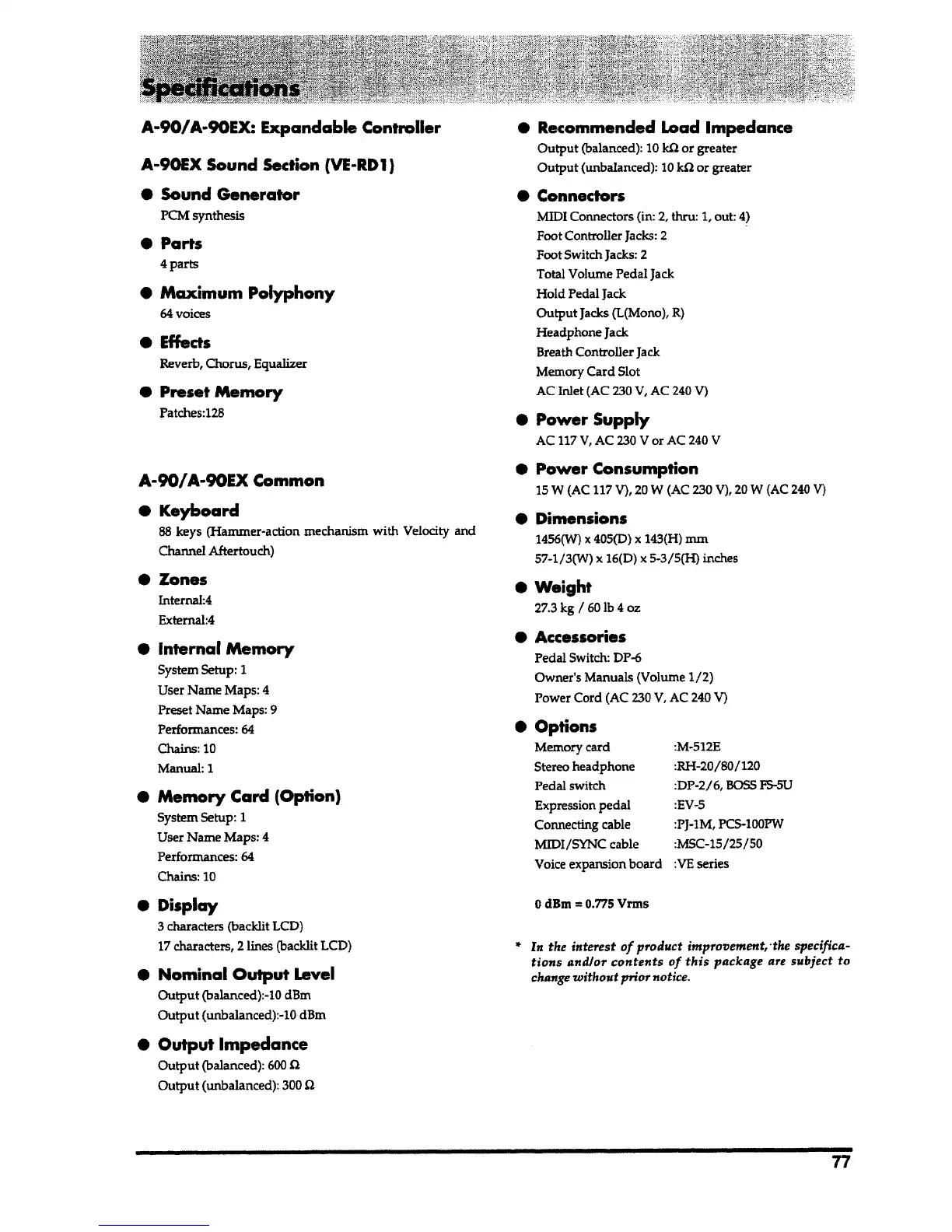 Roland A-90 - Specifications