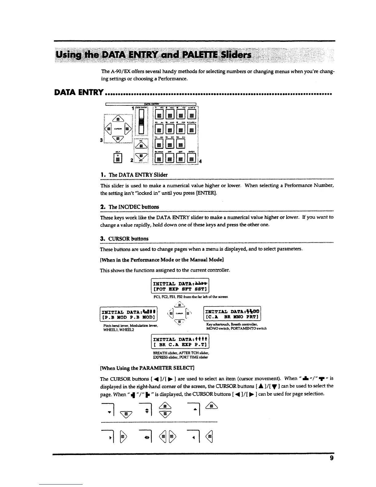 Roland A-90 - Using the Data Entry and Palette Sliders; The INC;DEC Buttons; Cursor Buttons