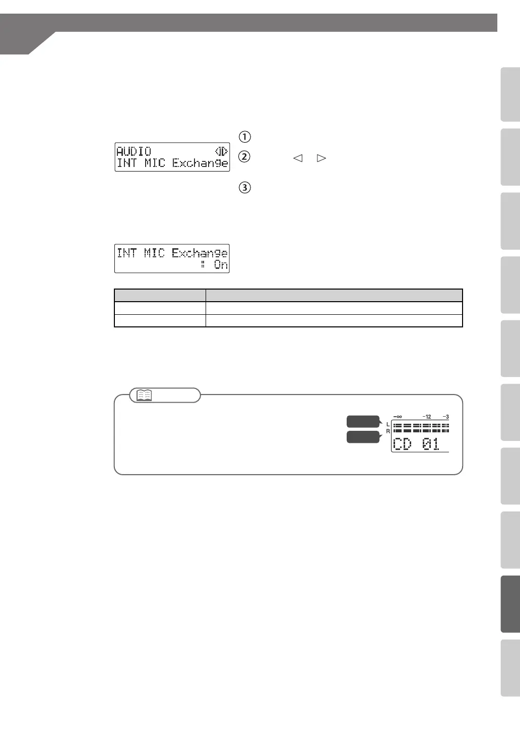 Off (factory setting) The left and right channels will not be exchanged for the internal mics.