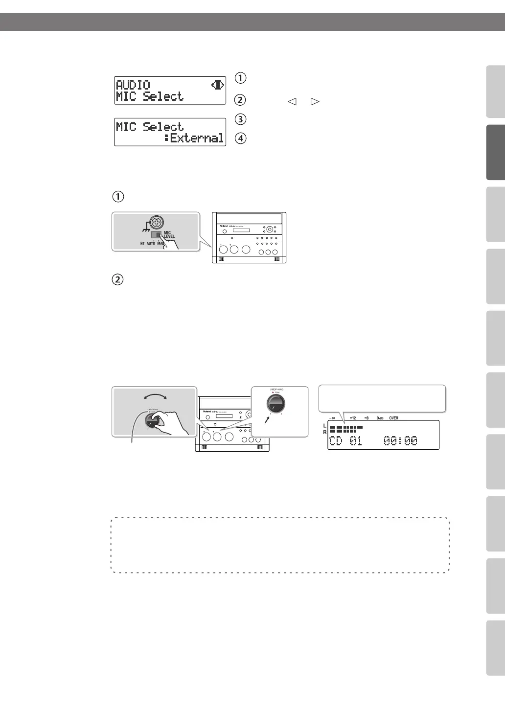 While producing the sound that you will actually be recording, turn the [MIC] knob to adjust