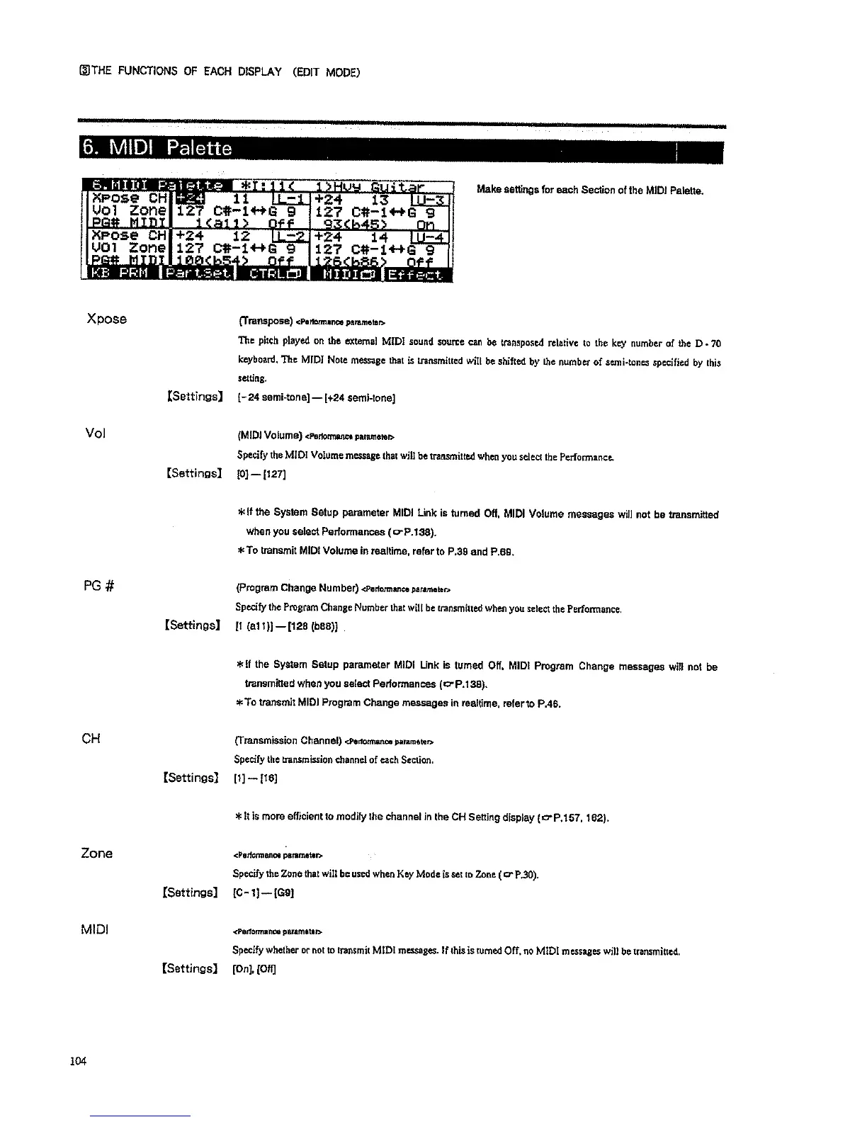Roland D-70 - D-70 Parameter Guide (Part 2); 6. MIDI Palette Settings