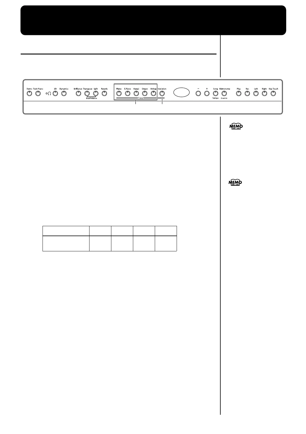 The DP-970 contains 20 different internal tones. The tones are organized into five