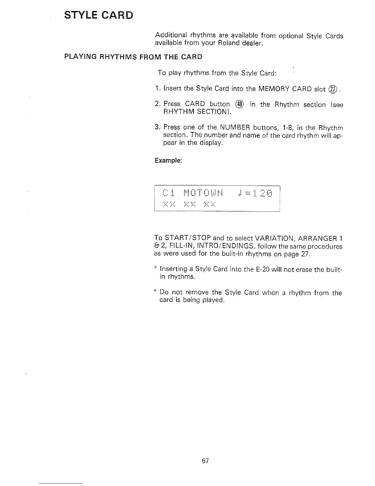 Roland E-20 - Style Card Rhythms; Playing Rhythms from Style Card