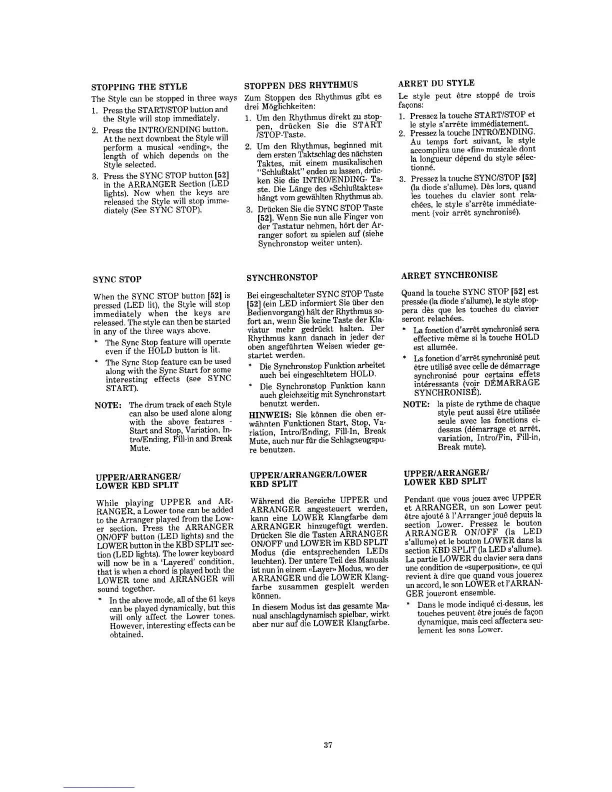 Roland E-30 - Stopping the Style; Sync Stop; Upper;Arranger;Lower KBD Split
