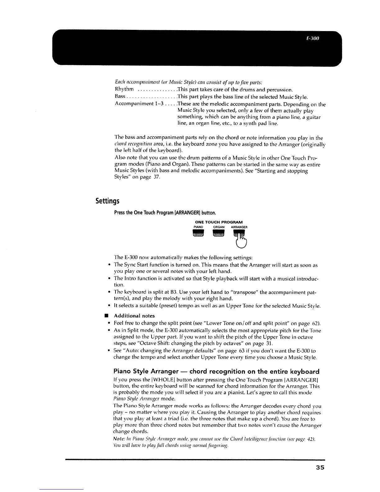 Roland E-300 - Arranger Settings and Notes; Piano Style Arranger with Full Keyboard Input