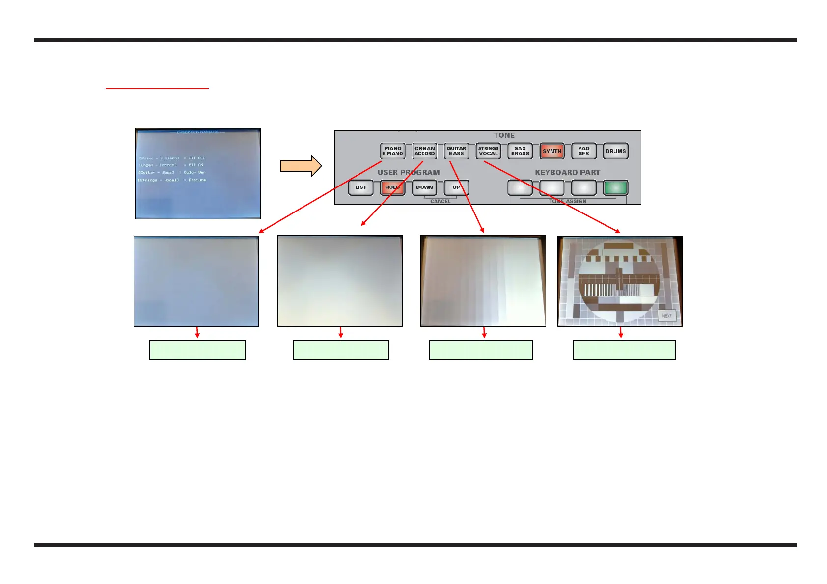 c Each of the four buttons of the TONE section flashing (PIANO E. PIANO, ORGAN ACCORD, GUITAR BASS, STRINGS VOCAL) is associated