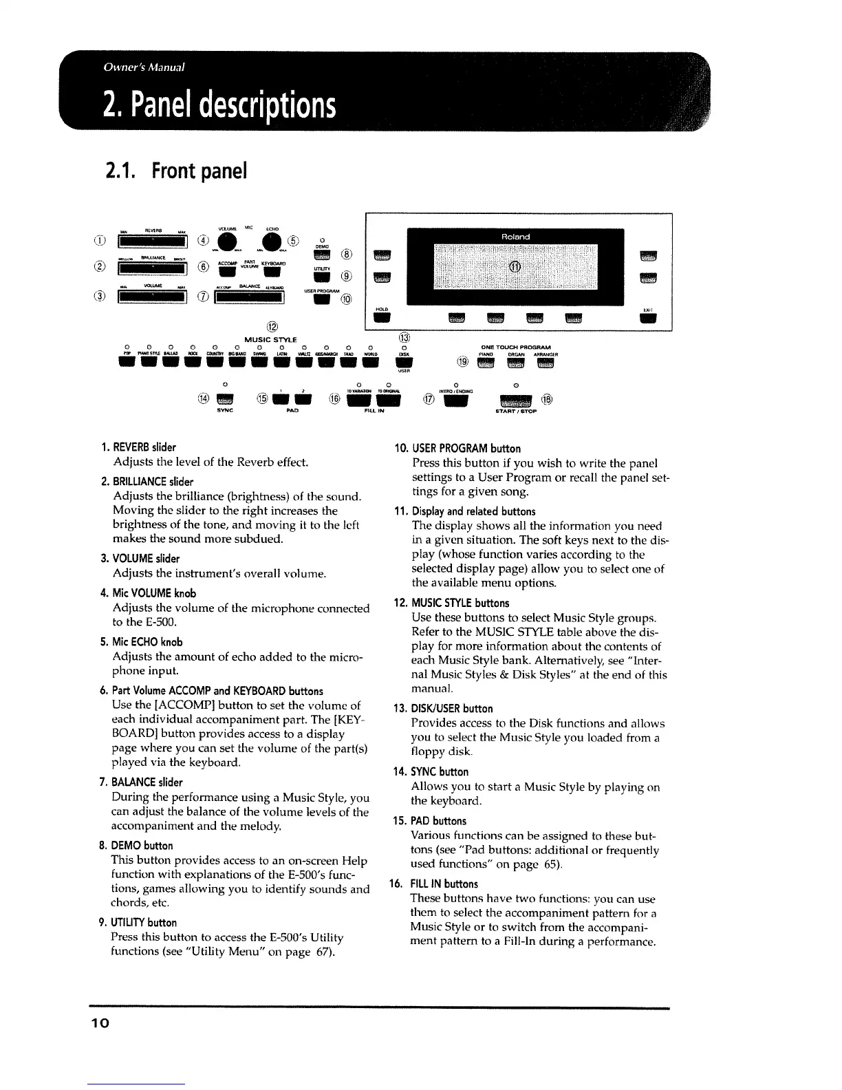 Roland E-500 - Panel Descriptions; Front Panel Controls