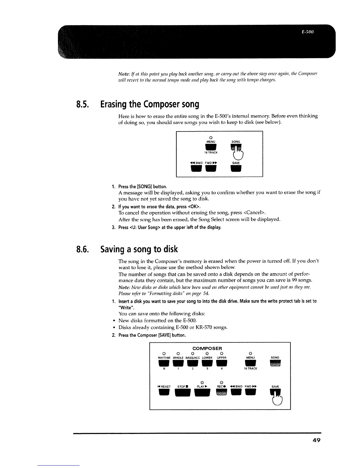 Roland E-500 - Saving and Erasing Songs; Song Management on Disk