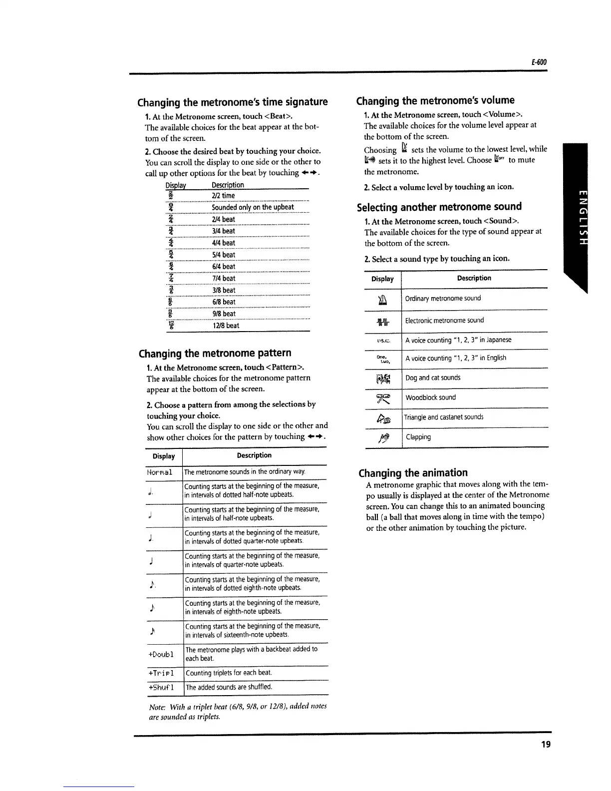 Roland E-600 - Changing the Metronomes Time Signature;Pattern;Volume; Selecting Anothr Metronome Sound; Changing the Animation
