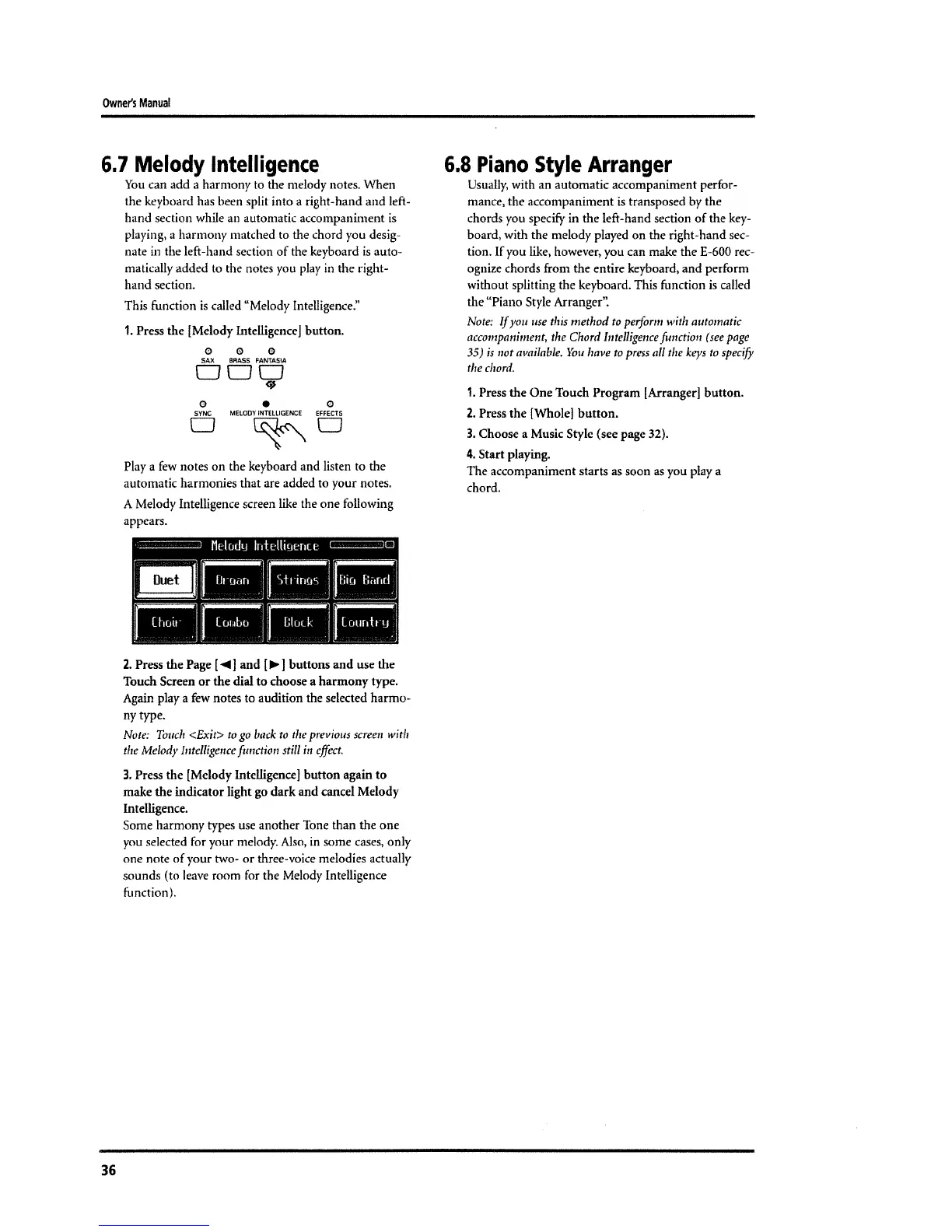 Roland E-600 - Melody Intelligence and Piano Style Arranger; Adding Harmonies and Piano Style Arrangement