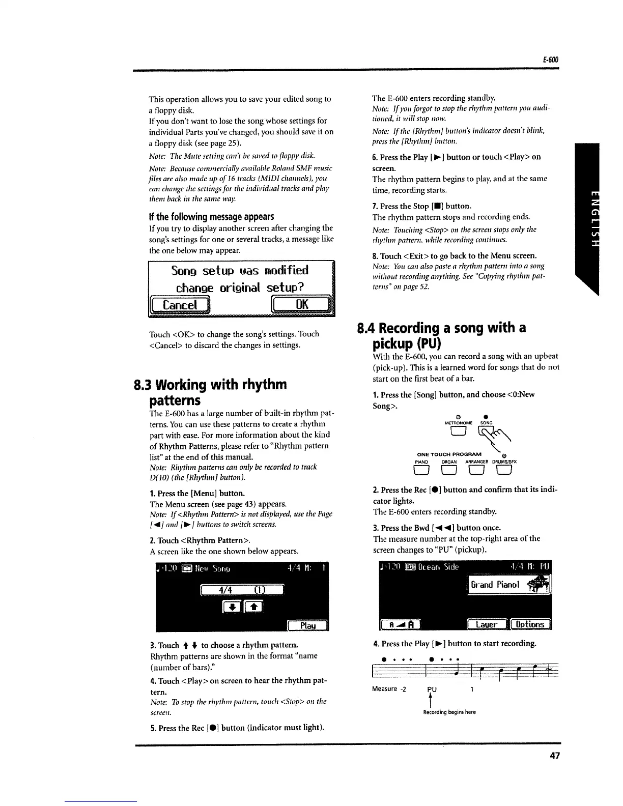 Roland E-600 - Rhythm Patterns and Pickup Recording; Working with Rhythm Patterns