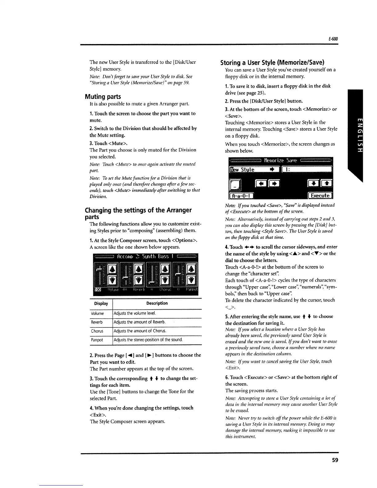 Roland E-600 - Storing and Muting Parts; Saving User Styles and Muting Arranger Parts