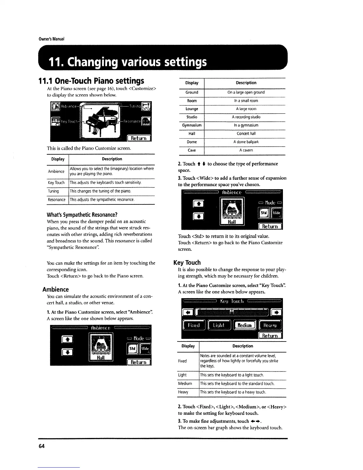 Roland E-600 - Changing Various Settings; One-Touch Piano Settings (Ambience, Key Touch)