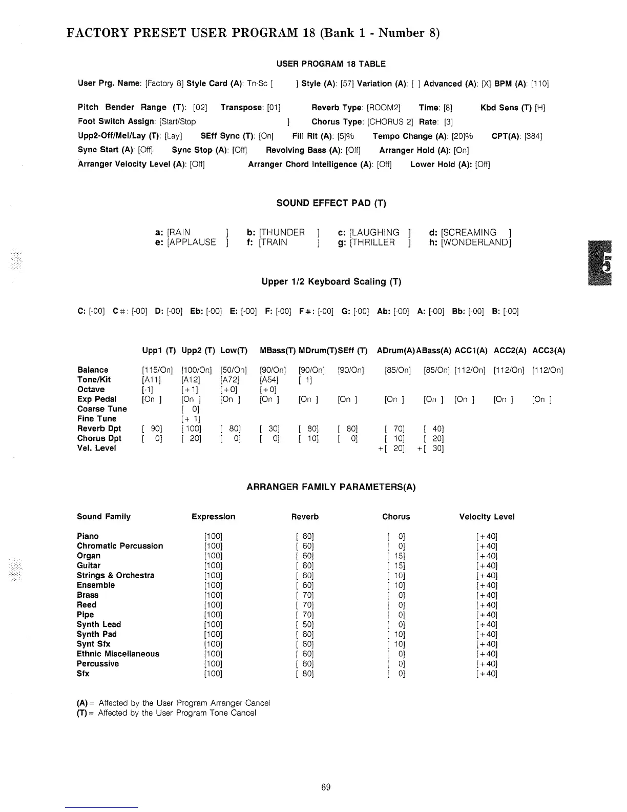 Roland E-70 - Factory Preset User Program 18 (Bank 1 - Number 8); User Program 18 Table
