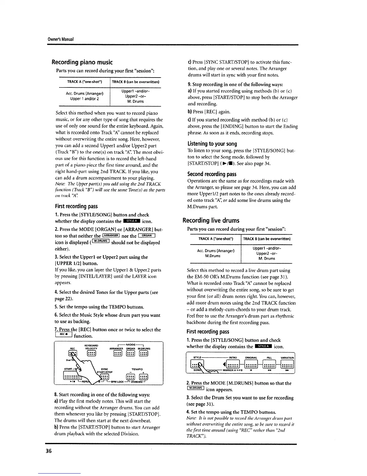 Roland EM-50 OR - Recording Modes: Piano and Drums; Recording Piano Music; Recording Live Drums