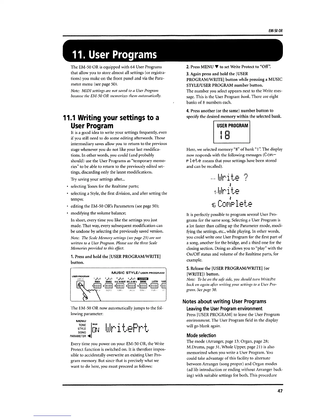 Roland EM-50 OR - User Programs for Saving Settings; Writing Settings to User Programs; User Program Notes and Environment