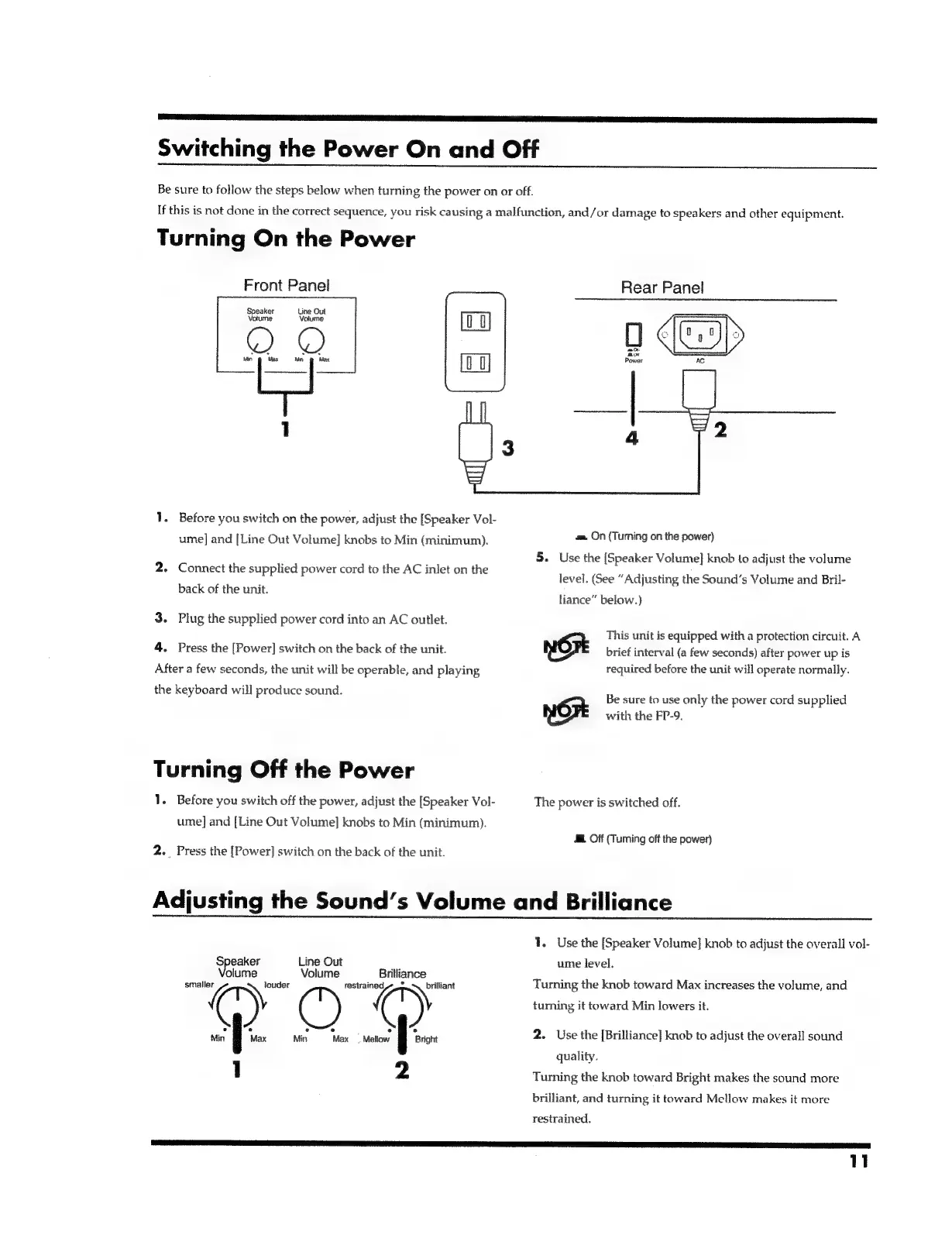 Roland FP-9 - Switching the Power on and off; Adjusting the Sounds Volume and Brilliance