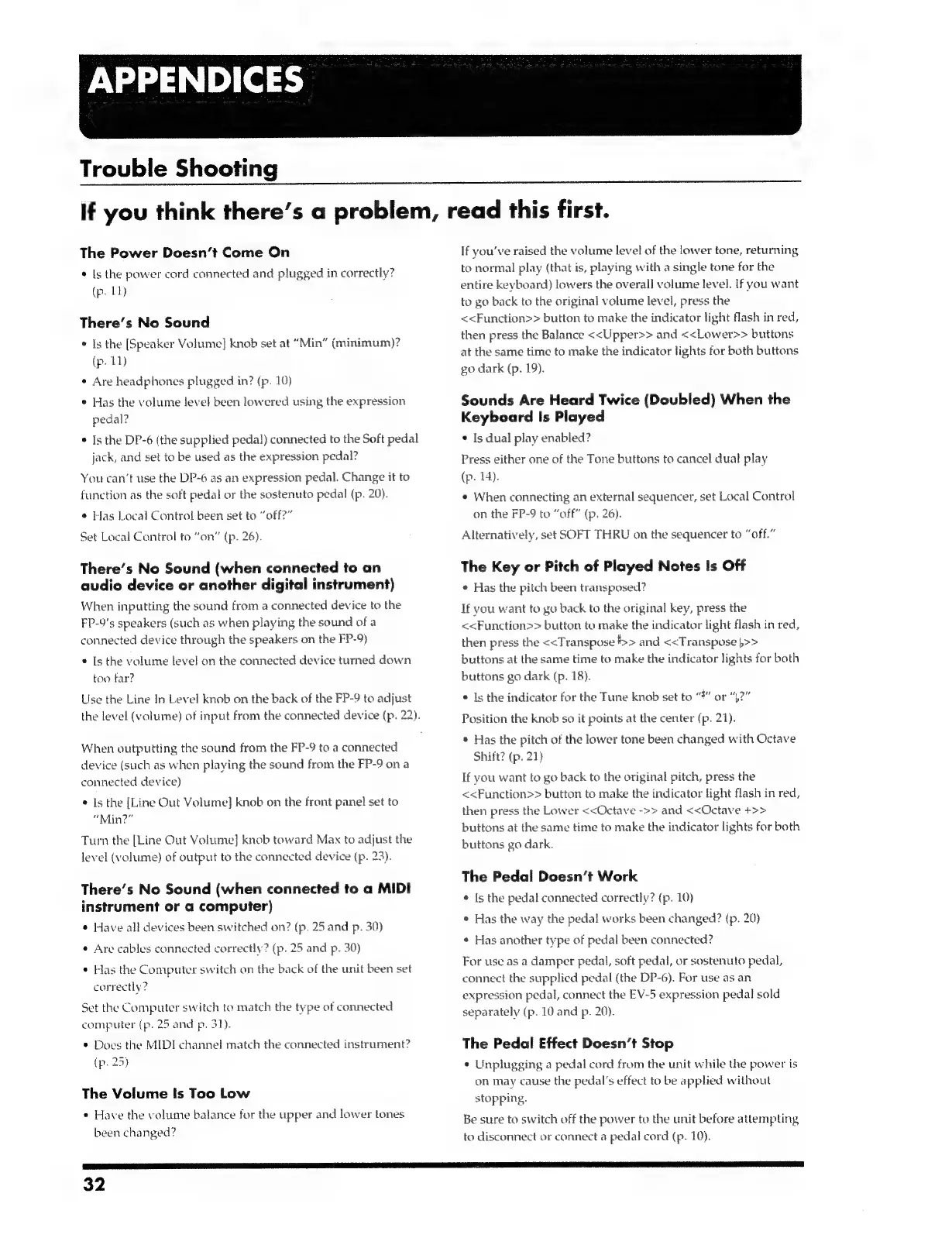 Roland FP-9 - Appendices; Trouble Shooting
