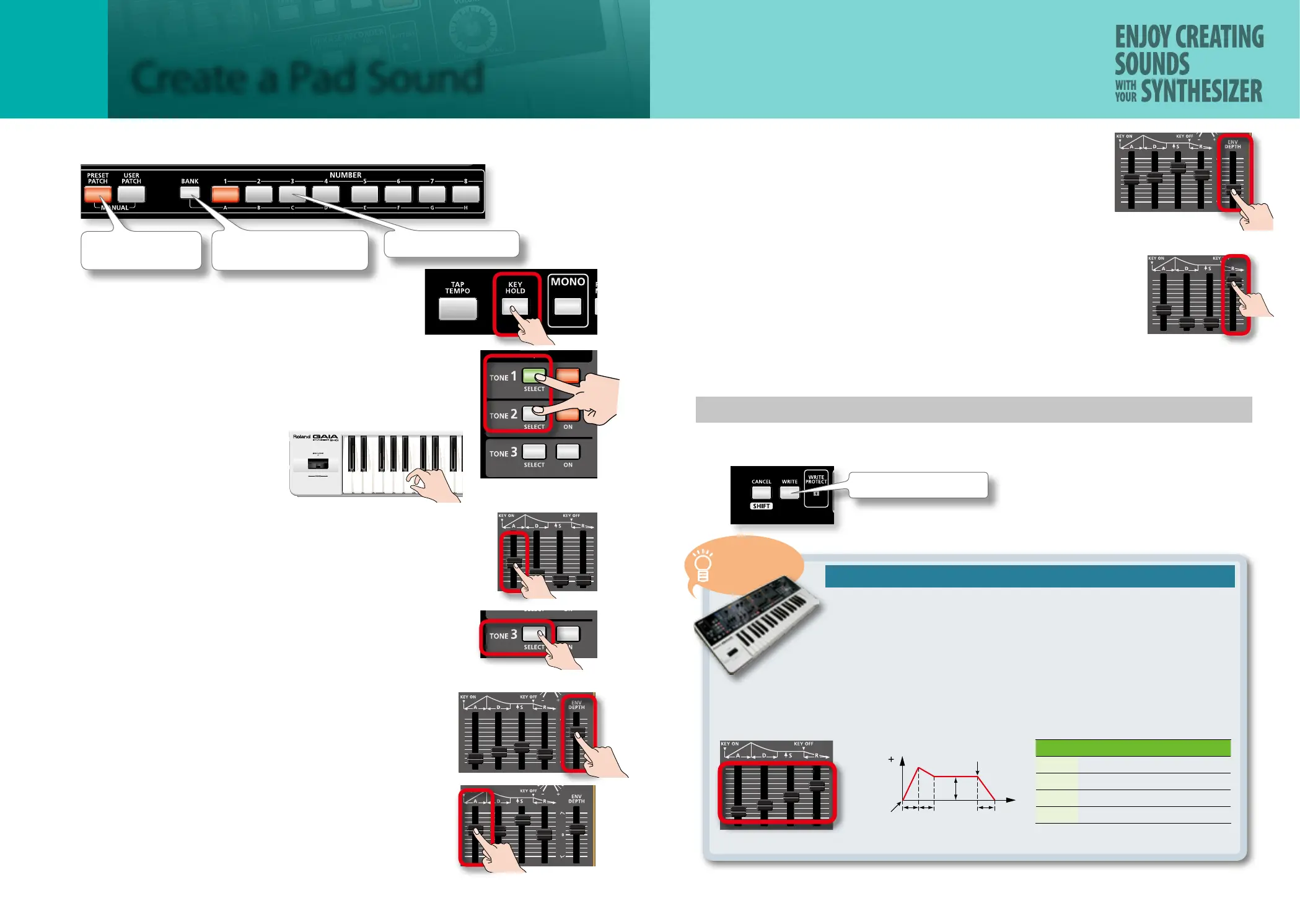 Raise or lower the [A] [D] [S] [R] sliders, and notice how they aect the sound.