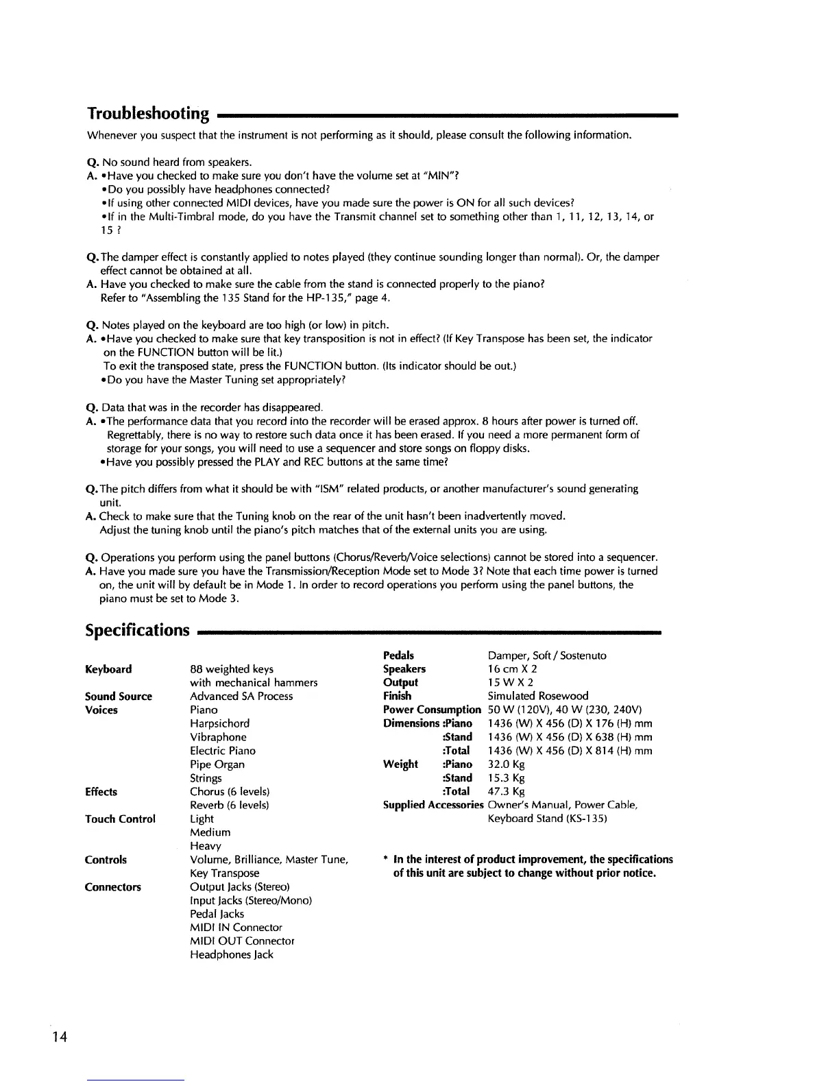 Roland HP-135 - Troubleshooting and Specifications; Problem Solving and FAQs