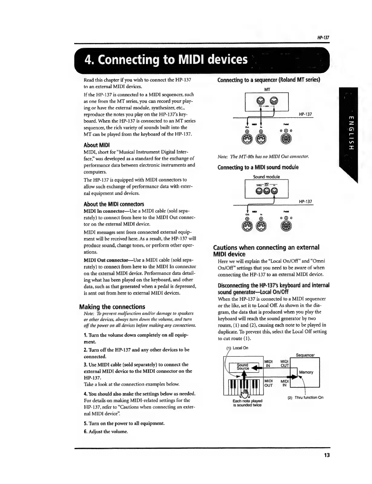 Roland HP 137 - Connecting to MIDI Devices; Making MIDI Connections; MIDI Connection Cautions