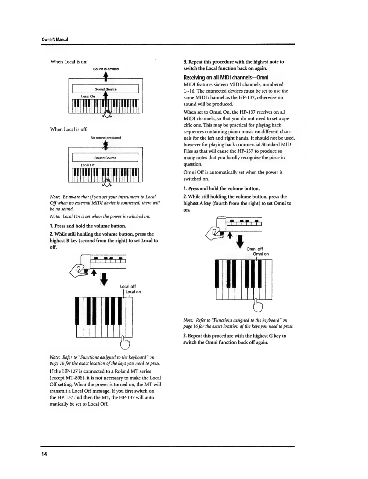 Roland HP 137 - Local On;Off Setting; Omni Mode for MIDI Reception