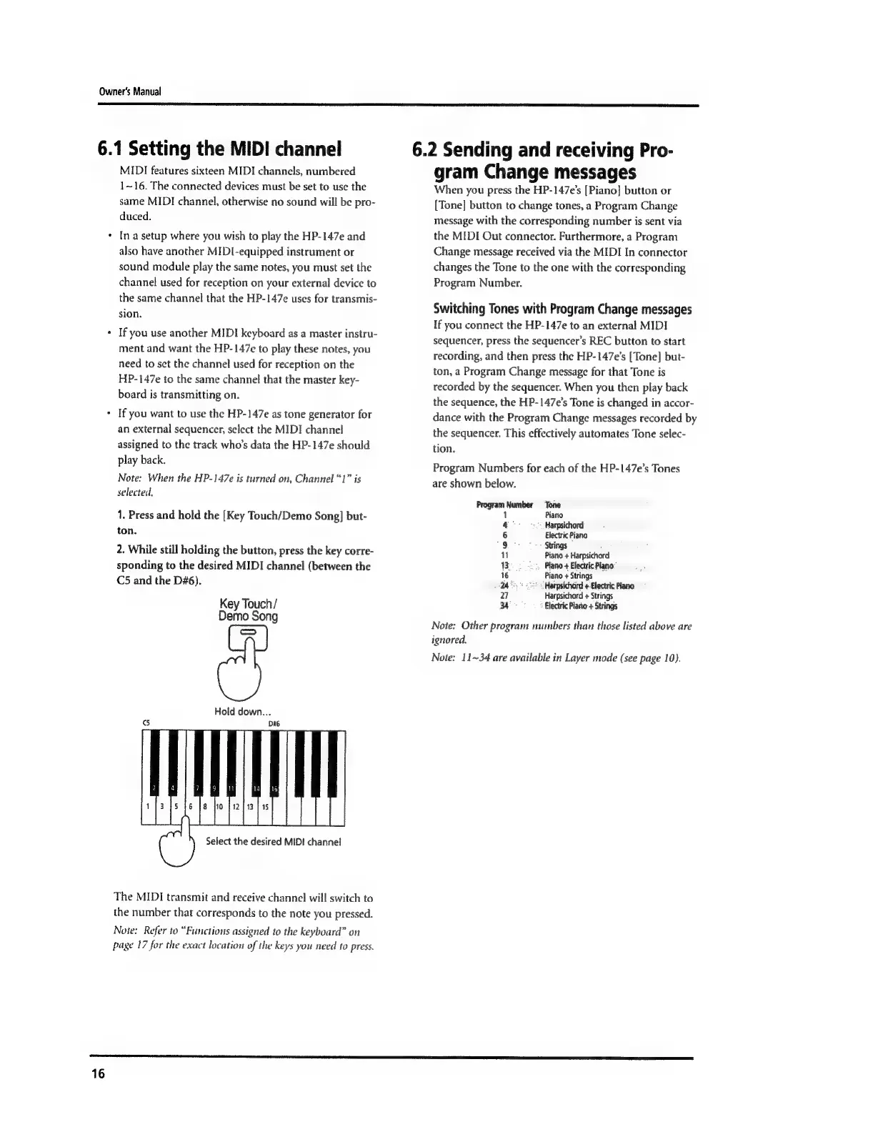 Roland HP 147 e - MIDI Channel and Program Changes; Setting the MIDI Channel; Program Change Messages for Tones