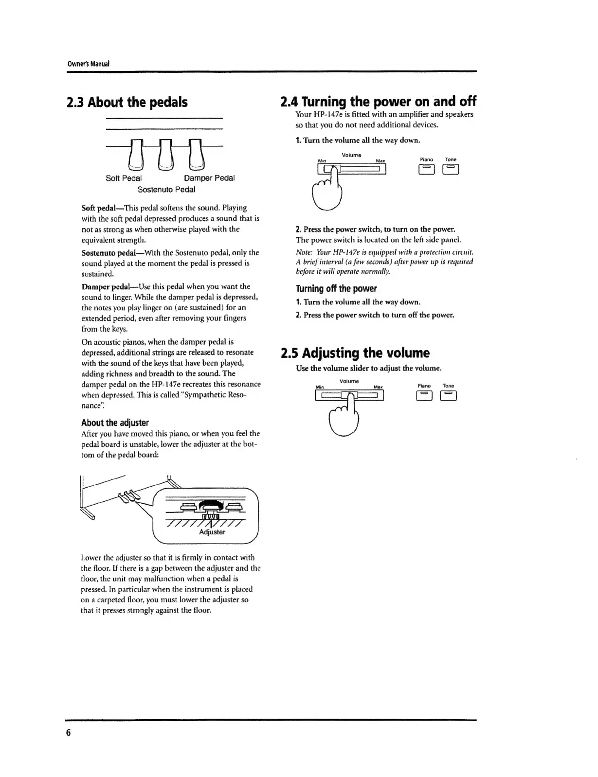 Roland HP 147 e - Pedals, Power, and Volume; Pedal Functions and Adjuster