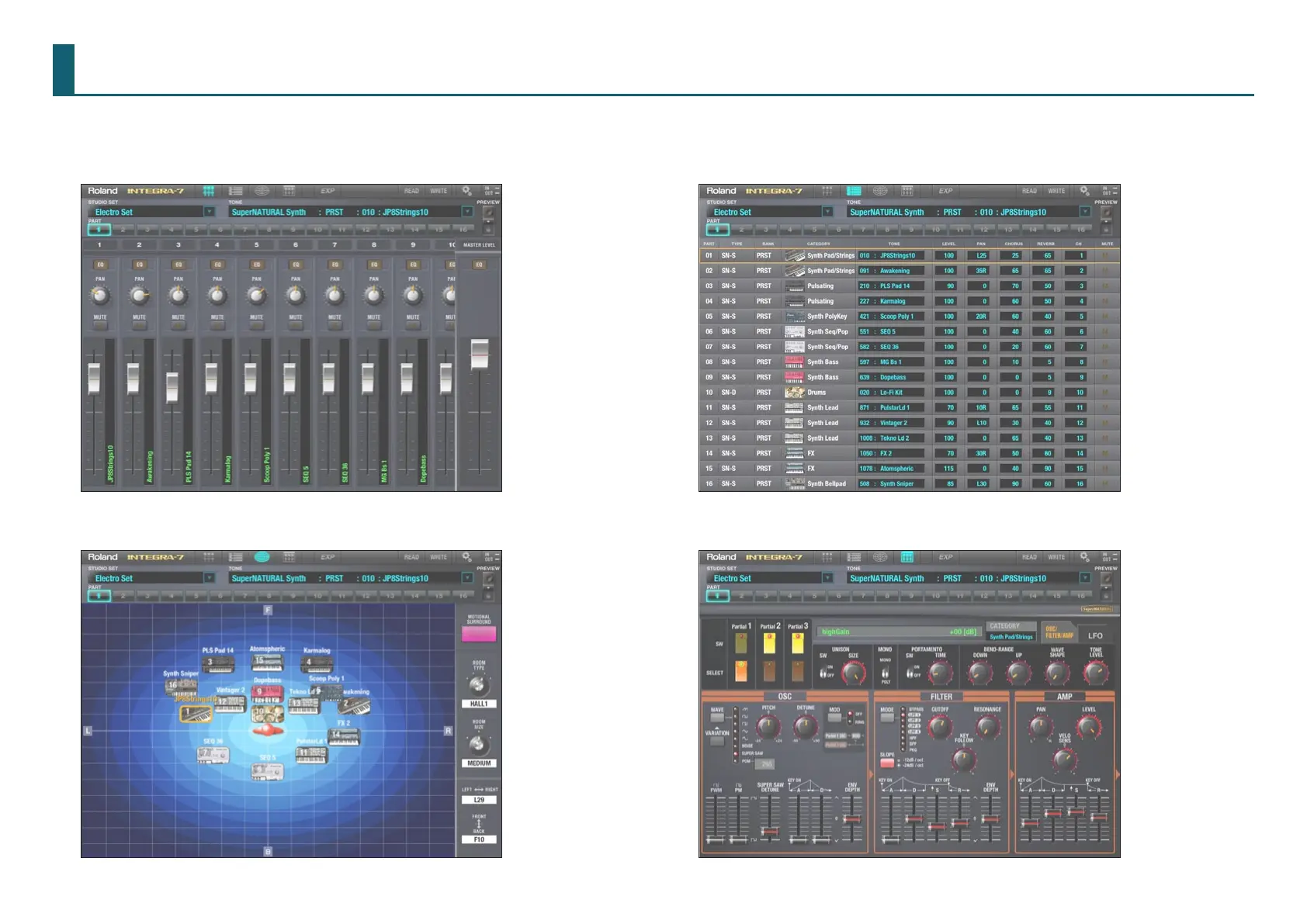 INTEGRA-7 Editor for iPad consists of the following four screens.
