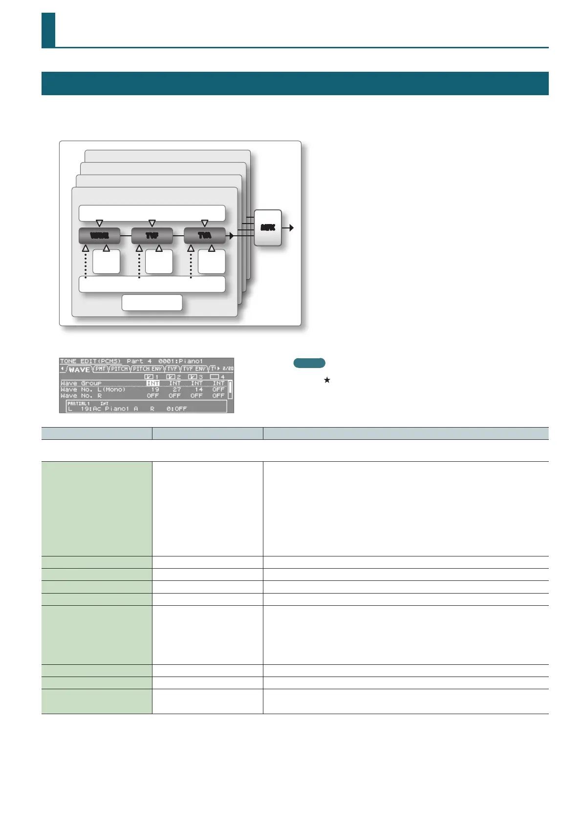 Each tone has settings for four sets (Partial 1–4) of WAVE, TVF, TVA, and LFO×2, in addition to multi-eect (MFX) settings.