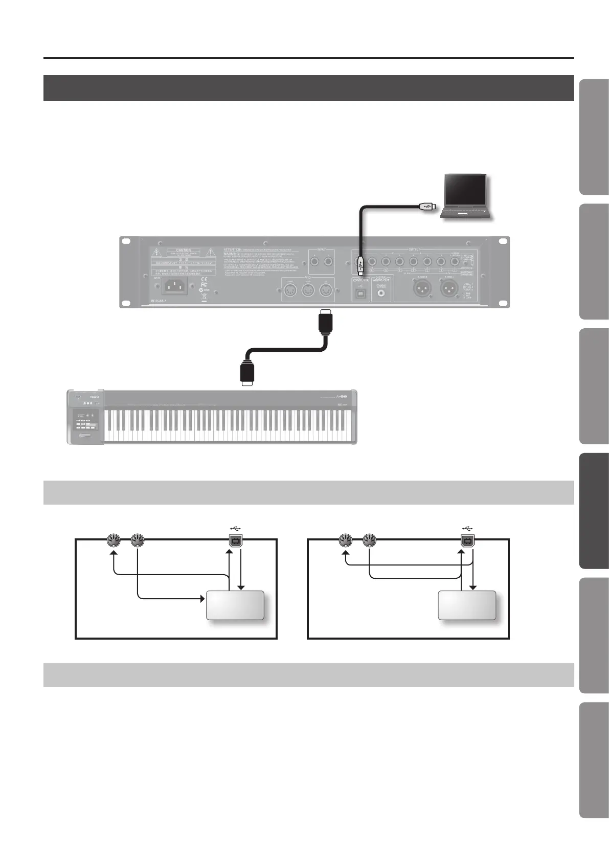 If you connect your computer and MIDI keyboard to the INTEGRA-7 as shown in the illustration and turn the USB-MIDI Thru ON, you’ll be able to use