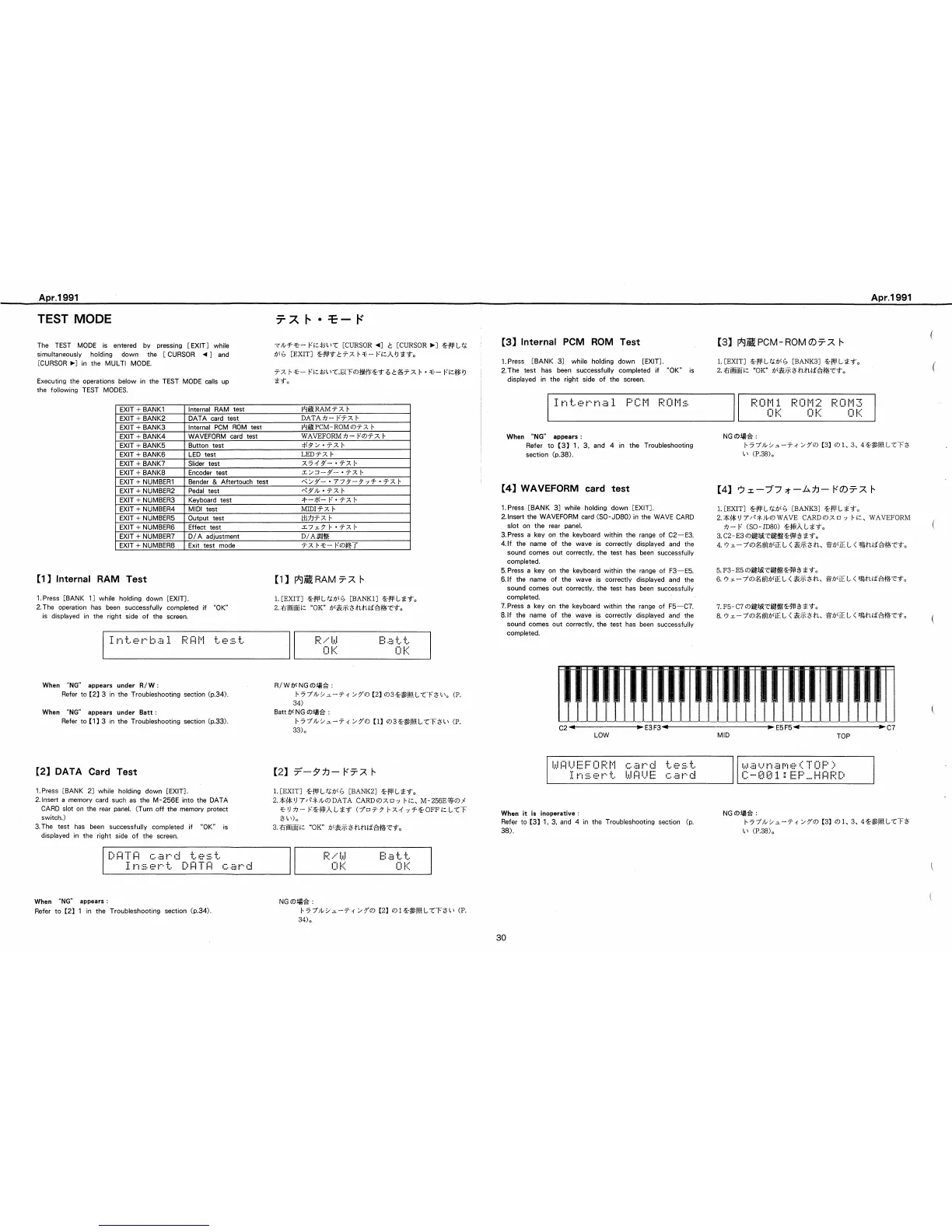 Roland JD-800 - TEST MODE PROCEDURES; Internal RAM Test; DATA Card Test; Internal PCM ROM Test