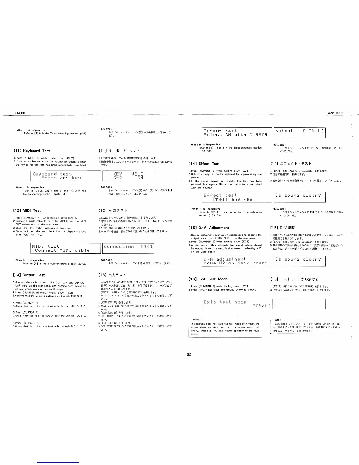 Roland JD-800 - TEST MODE PROCEDURES (CONTINUED); Keyboard Test; MIDI Test; Output Test