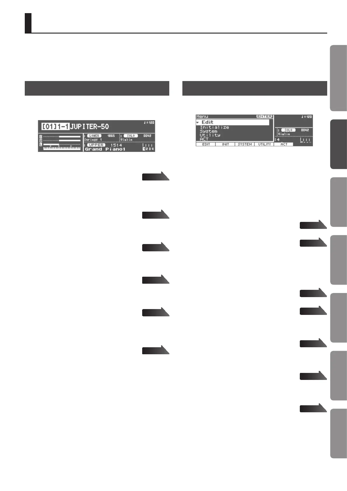 On the JUPITER-50, you can navigate between the screens by pressing each button or the function buttons assigned to various features. Here we