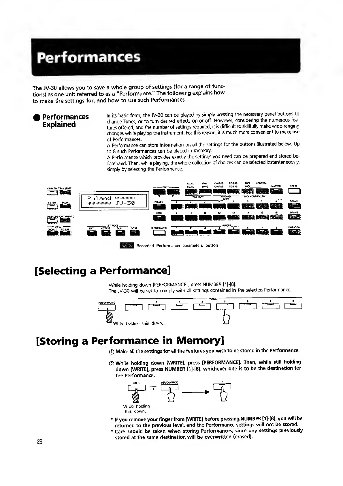 Roland JV-30 - Selecting a Performance; Storing a Performance