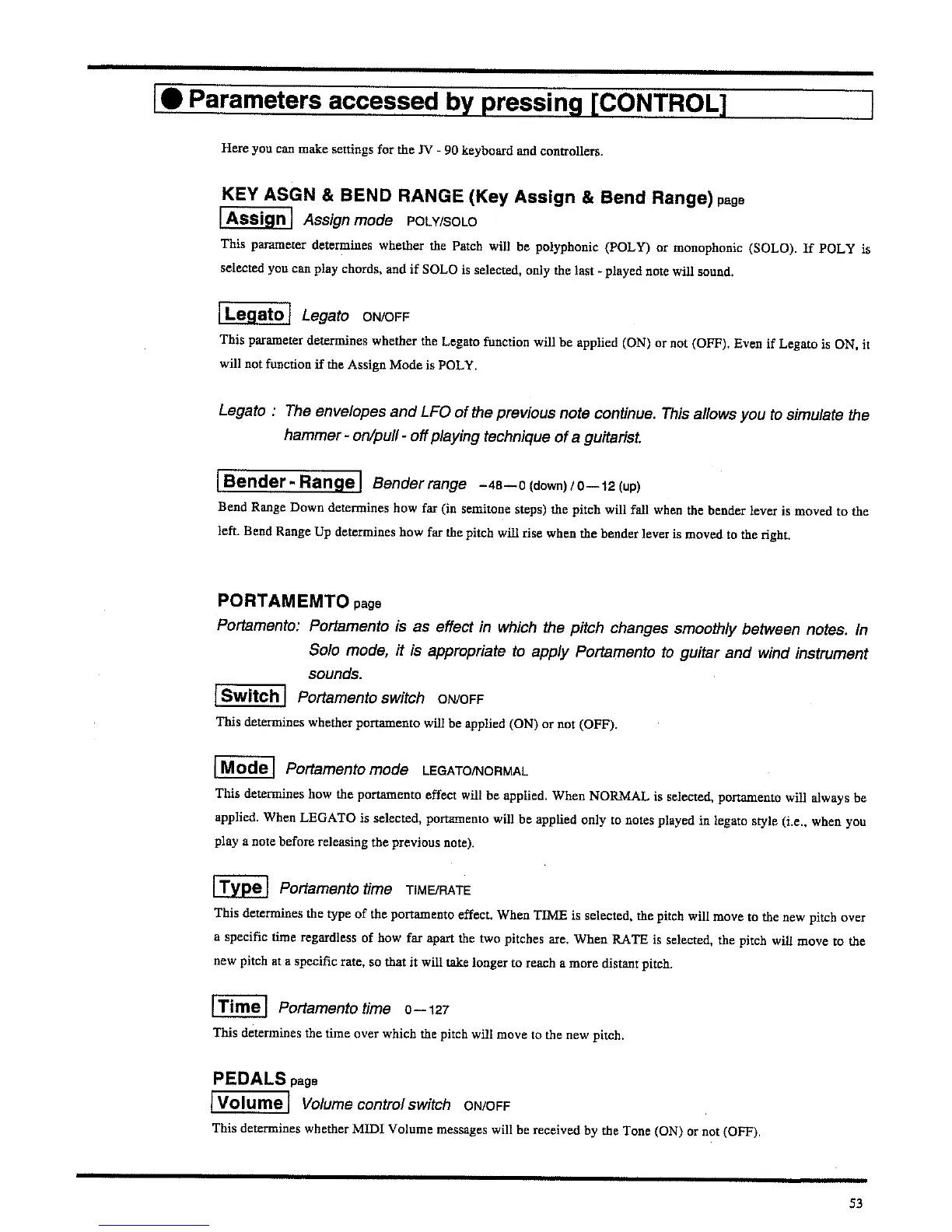 Roland JV-90 - Parameters accessed by pressing [CONTROL]