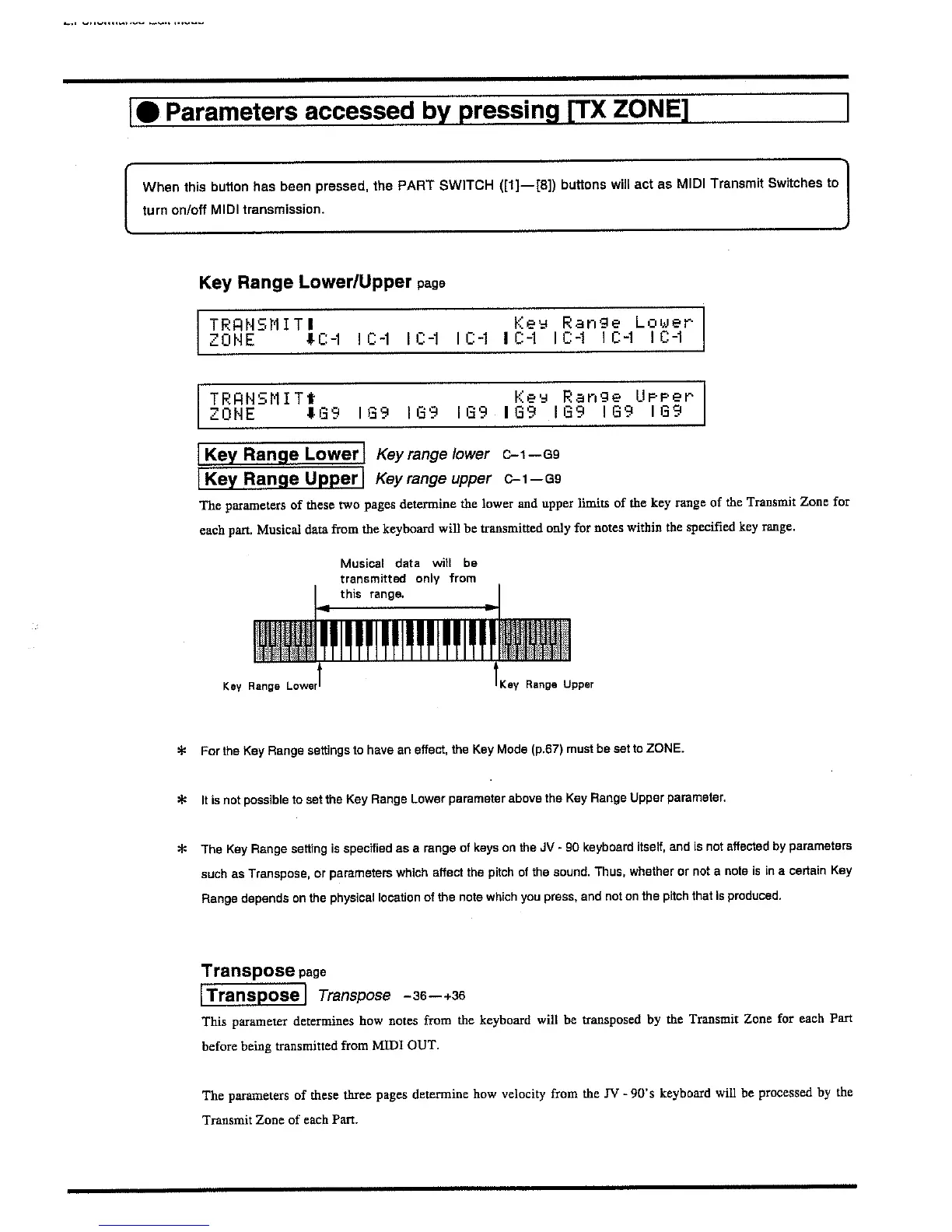 Roland JV-90 - Parameters Accessed by Pressing TX ZONE; Key Range Lower;Upper Page; Transpose Page