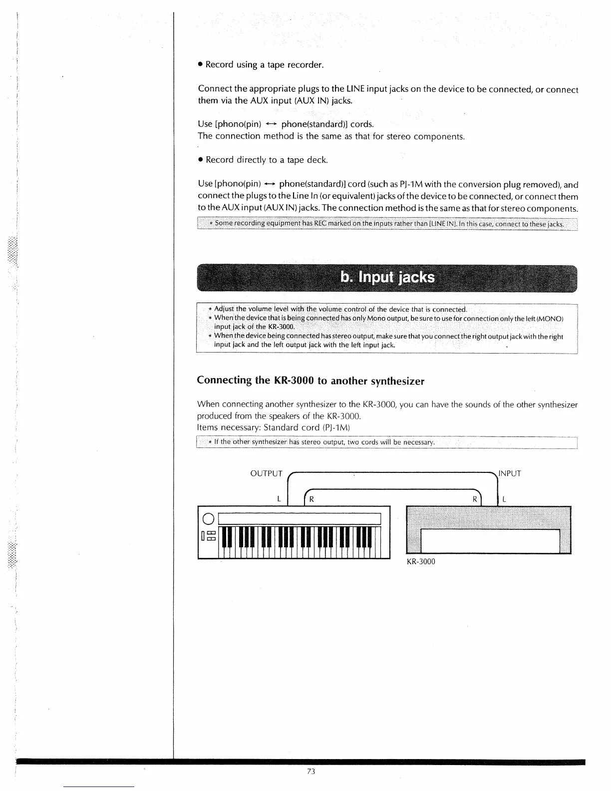 Roland KR-3000 - Input Jacks; Connecting the KR-3000 to Another Synthesizer