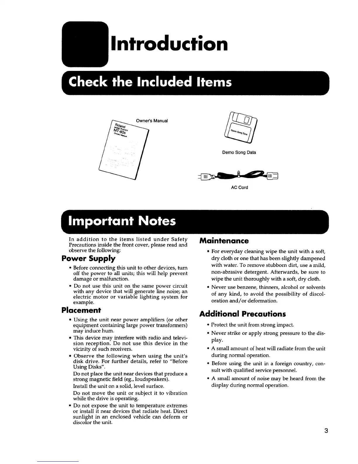Roland MT 80s - Introduction; Check the Included Items; Important Notes and Safety Precautions